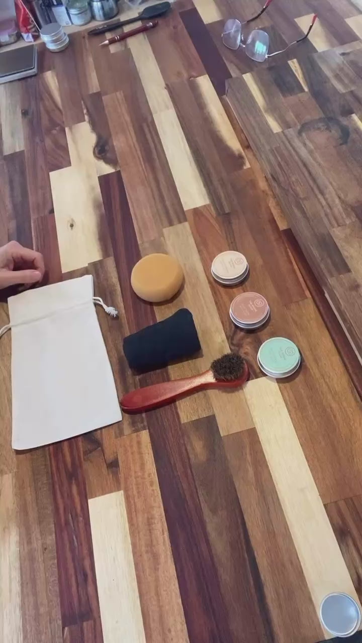 Éponge naturelle, microfibre douce et brosse en crin pour une brillance parfaite.